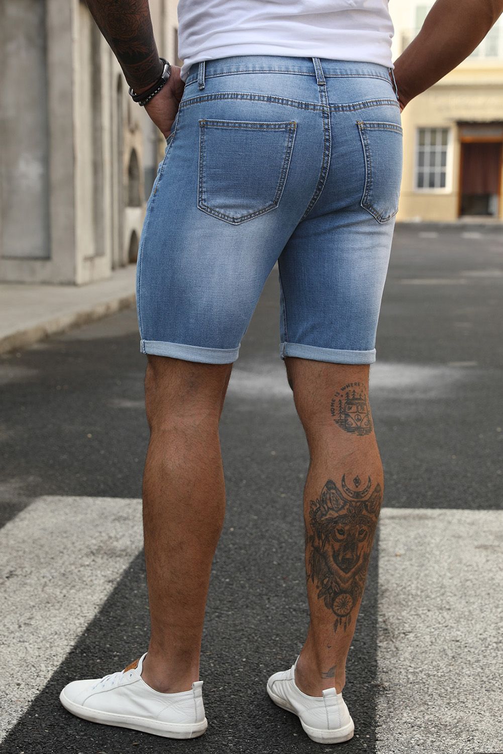 Slim-fit denim shorts with the rolled design is very trendy