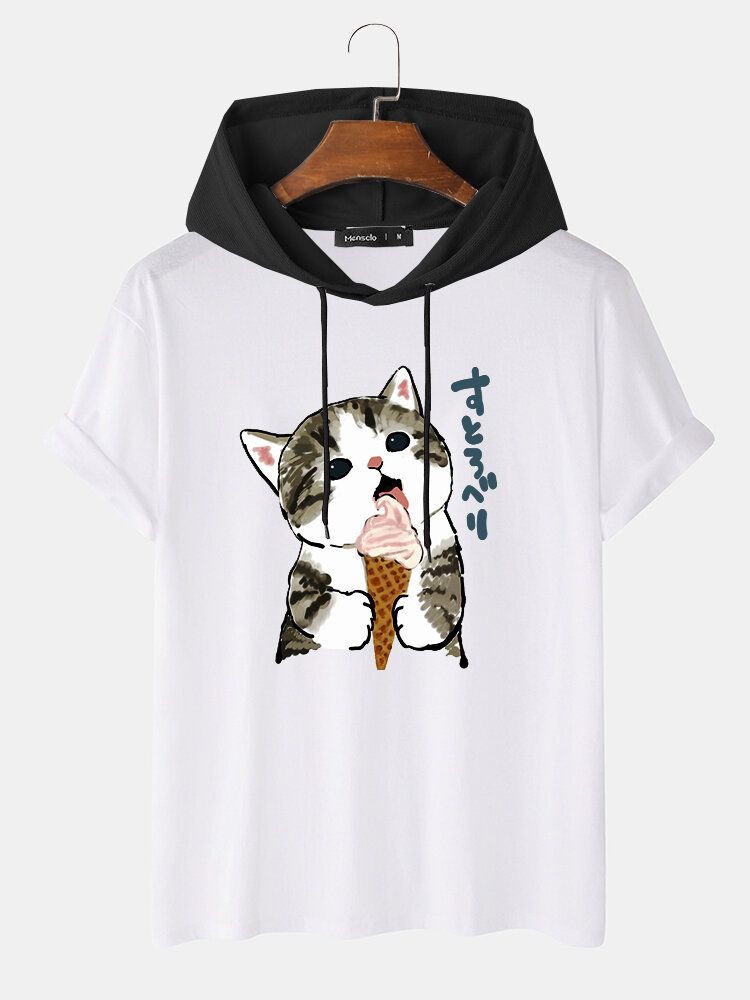 Mens Cute Cat Japanese Print Short Sleeve Drawstring Hooded T-Shirts