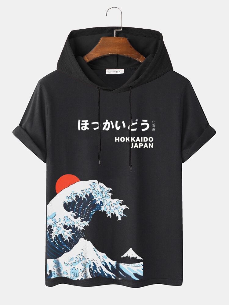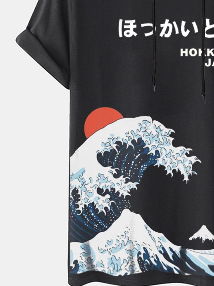 Mens Japanese Wave Print Short Sleeve Drawstring Hooded T-Shirts