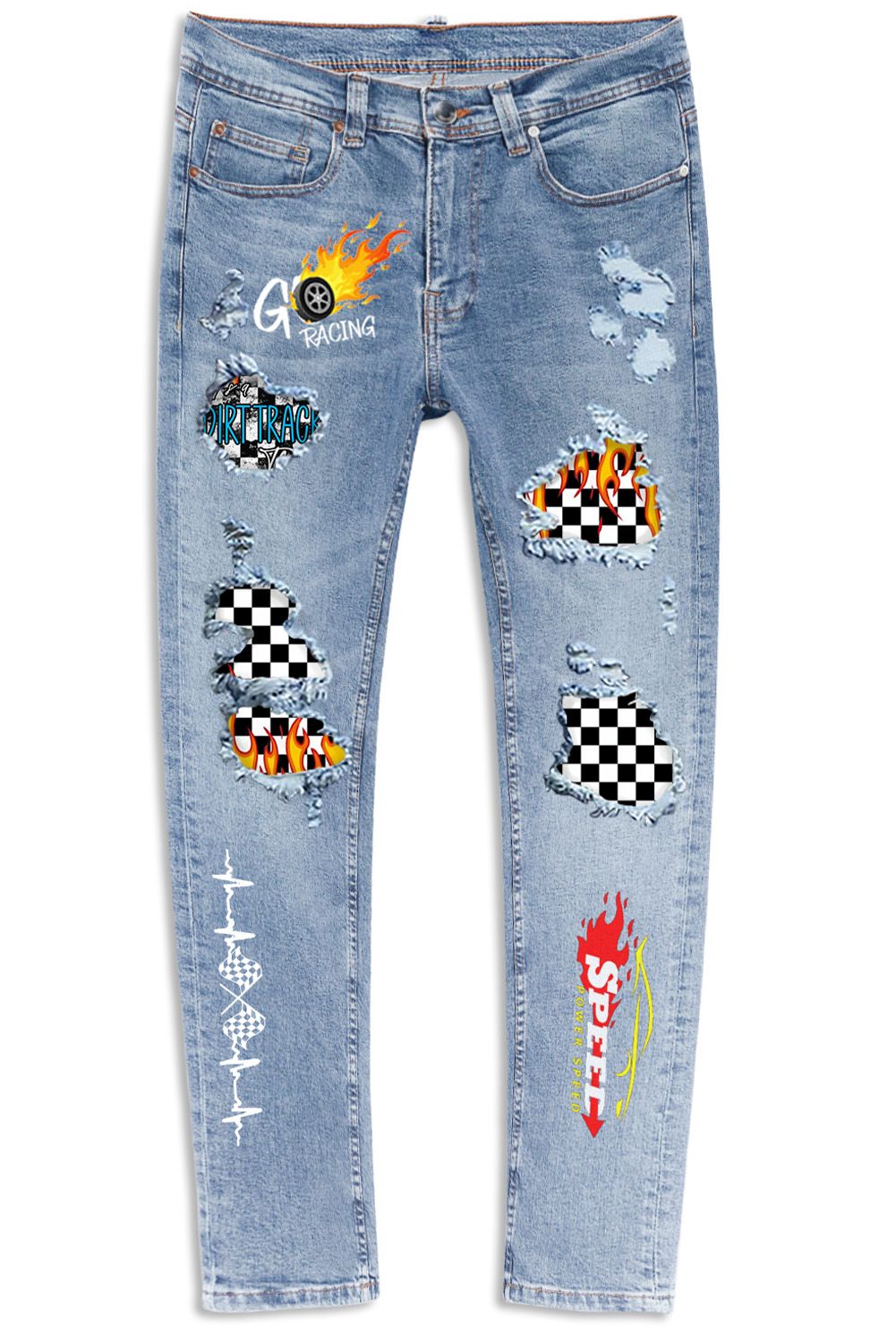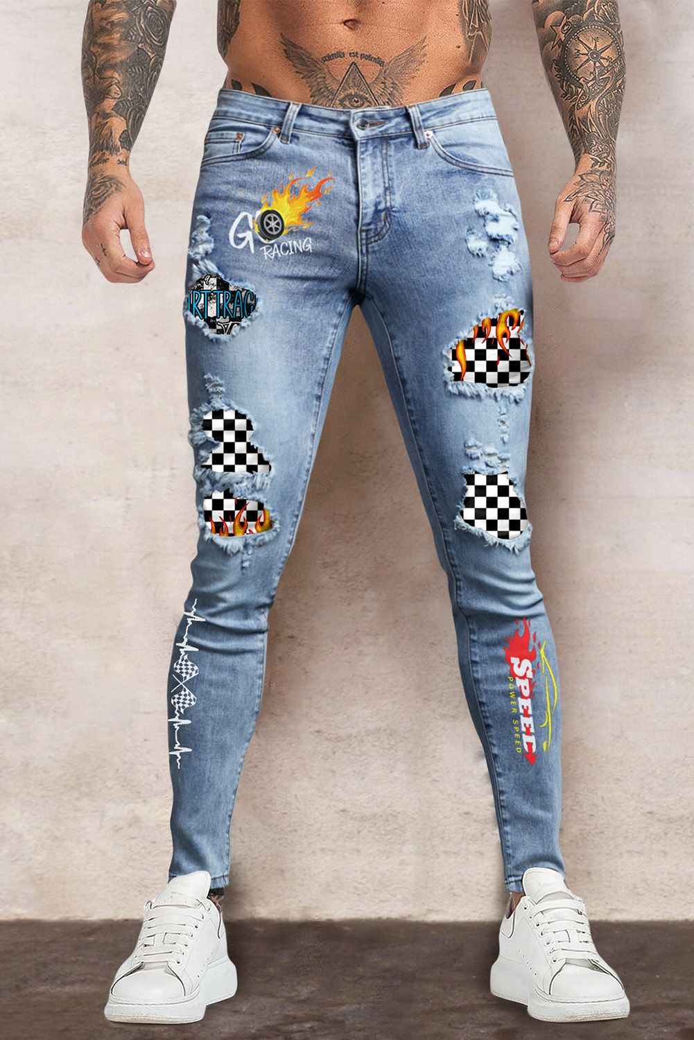Go Racing Mens Checkerboard Rip & Repair Jeans