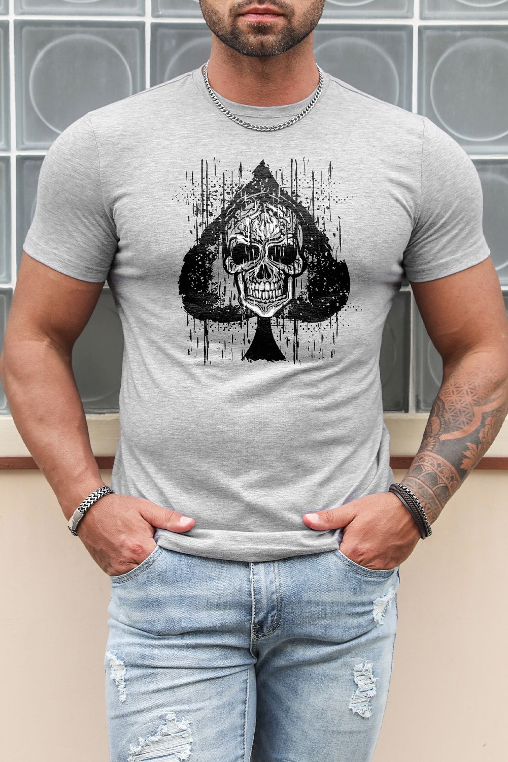 Gray Skull Spade Print Short Sleeve Men's Graphic Tee