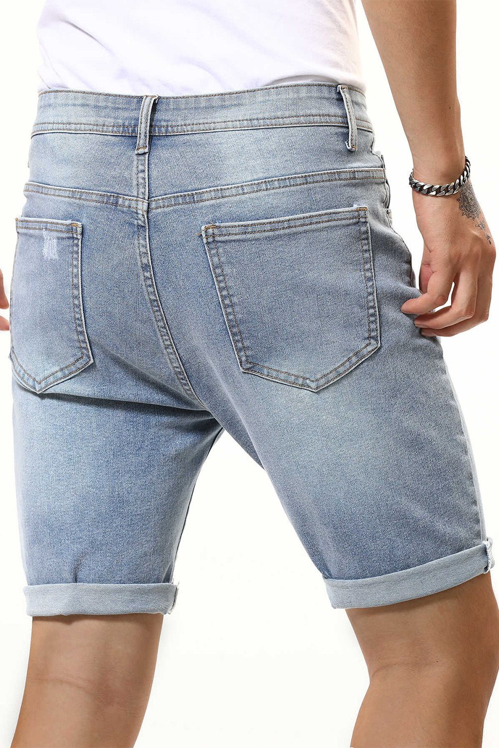 Sky Blue Skull Print Rolled Hem Ripped Men's Denim Shorts