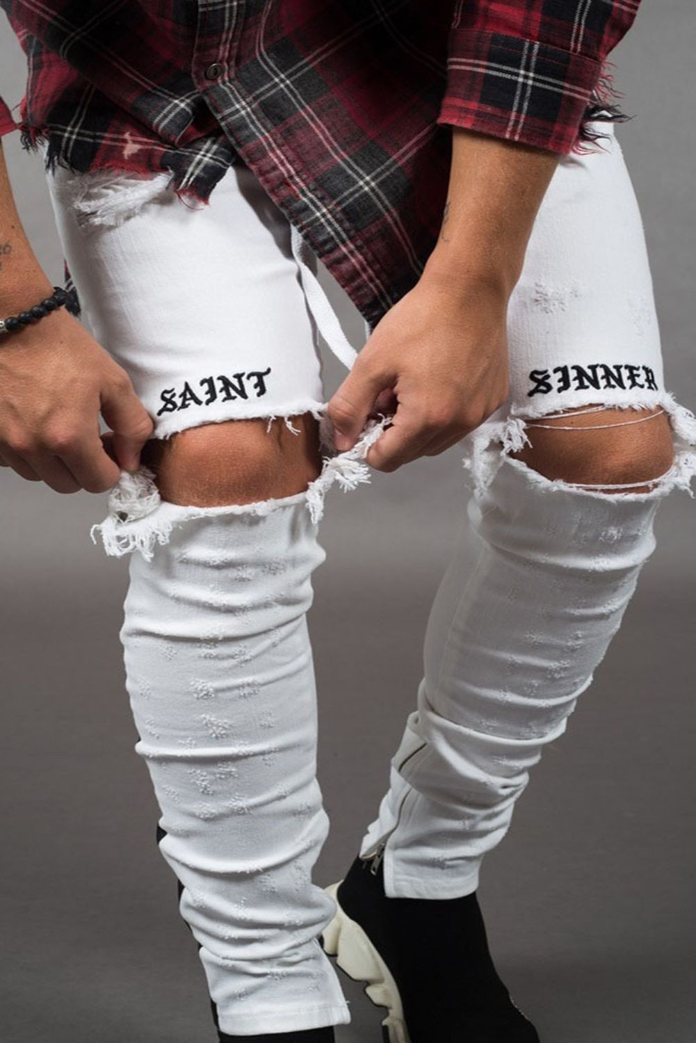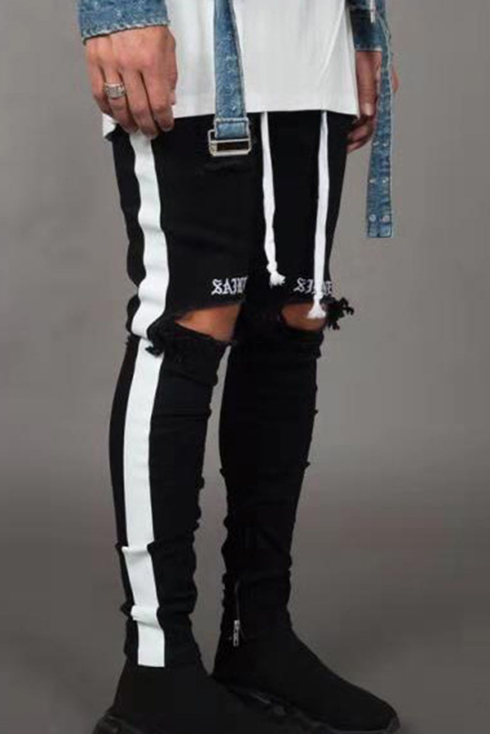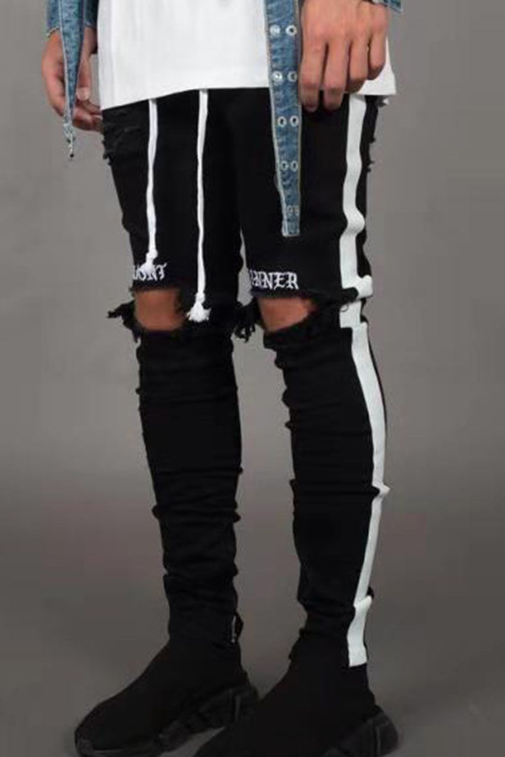 Black Letter Striped Print Ripped Slim-fit Men's Jeans