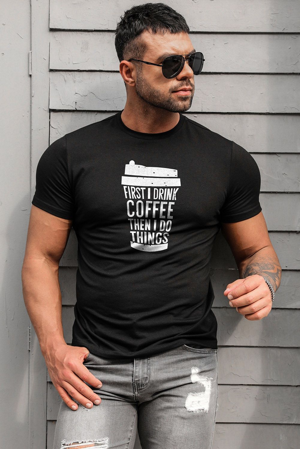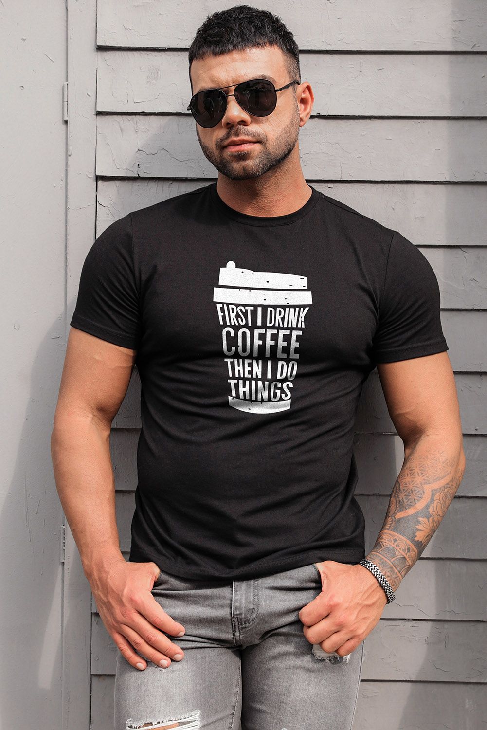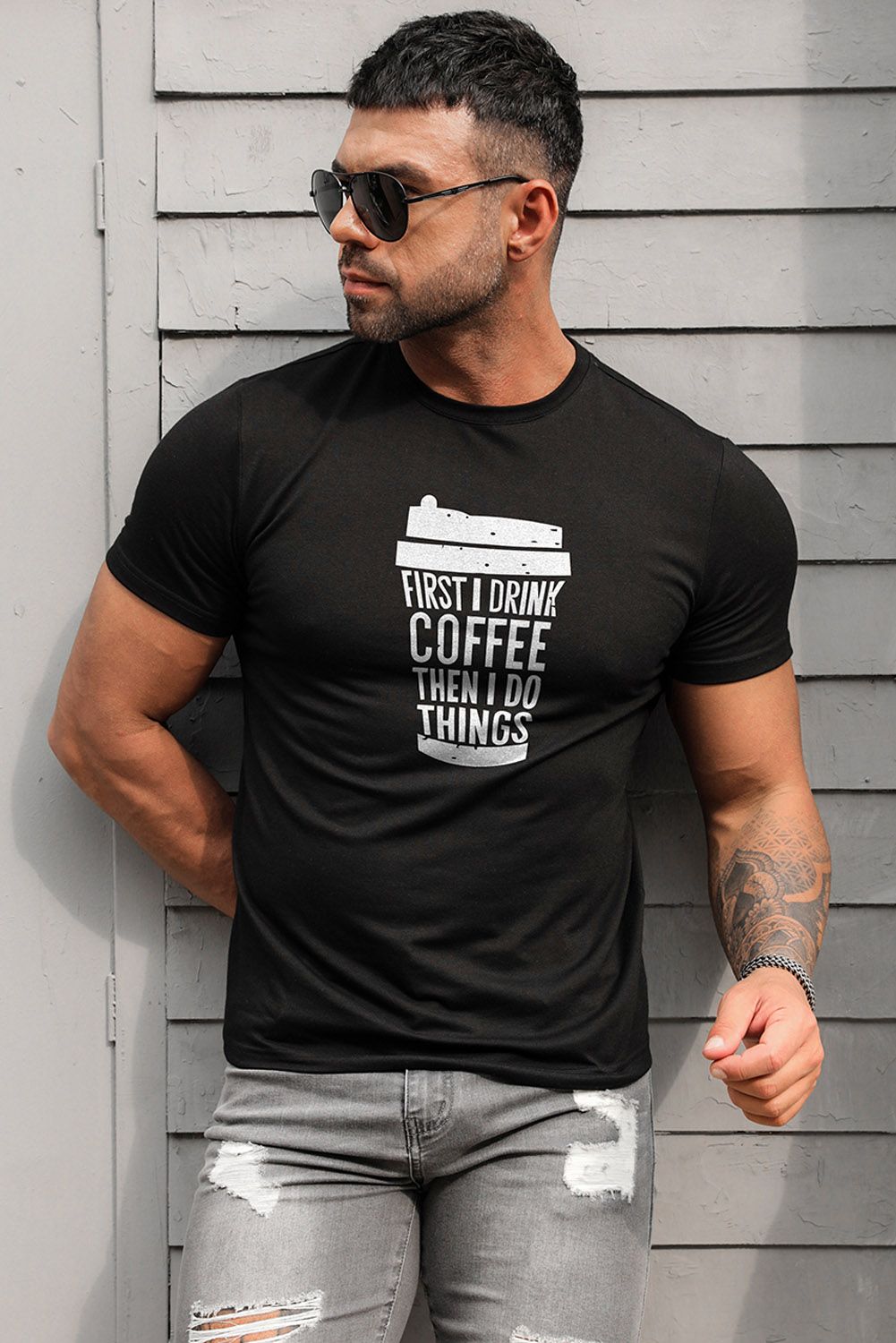 Black Men's Letter Coffee Cup Print Slim-fit Crewneck T Shirt