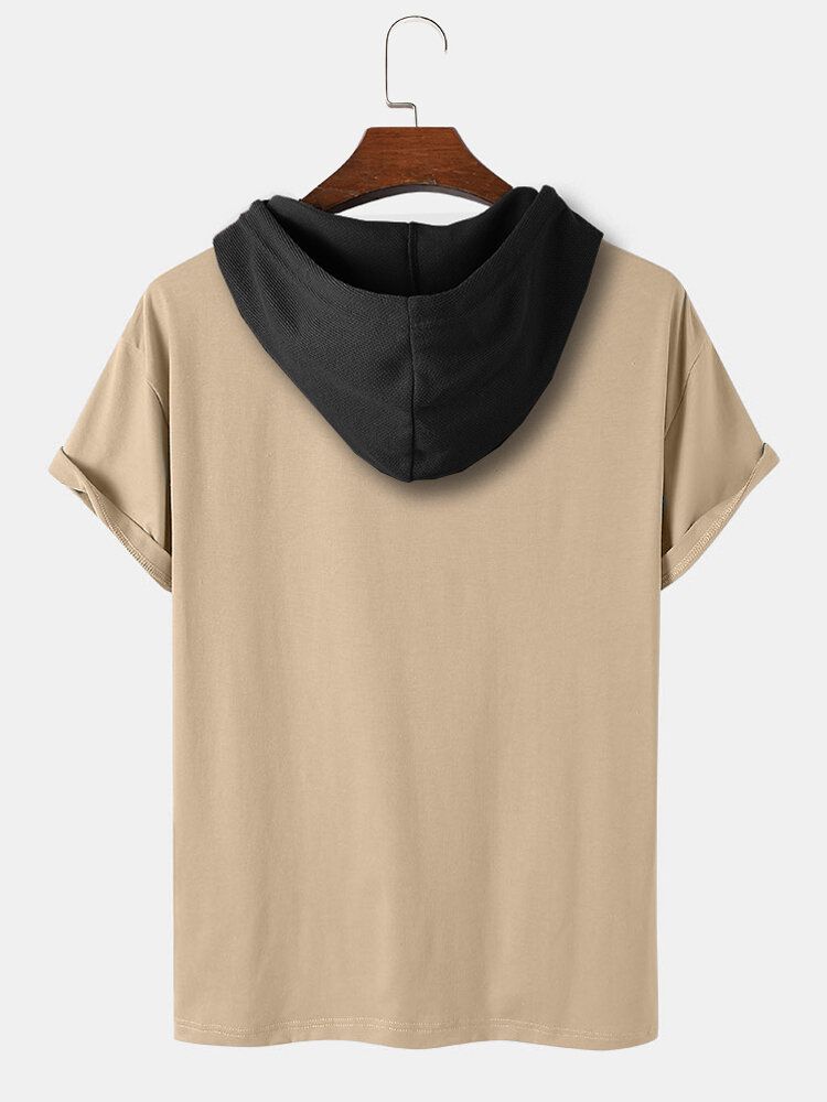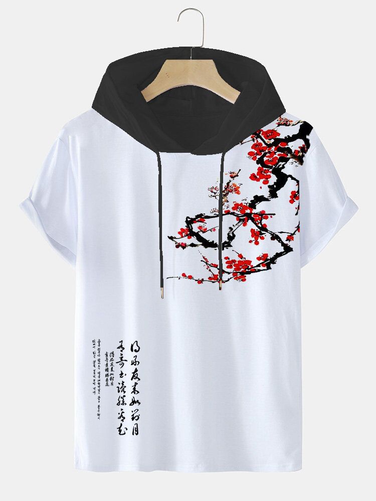 Mens Plum Bossom Character Print Contrast Short Sleeve Hooded T-Shirts