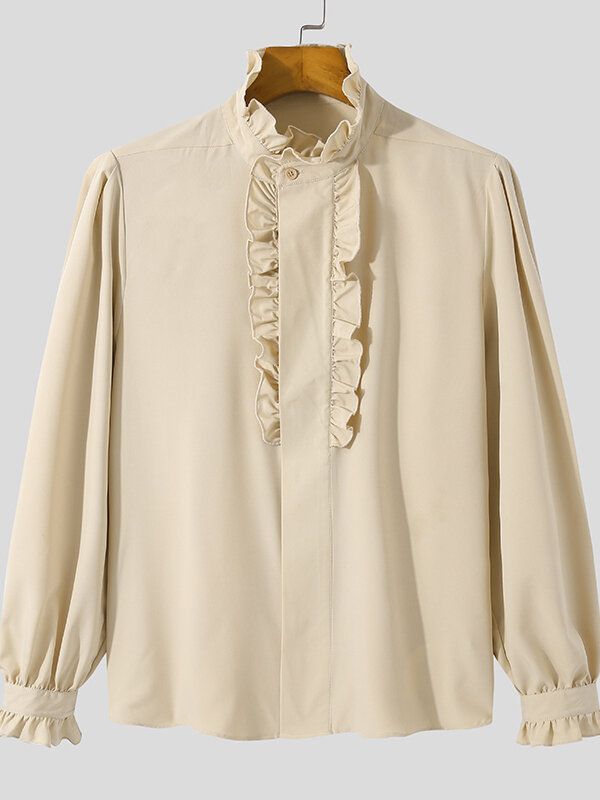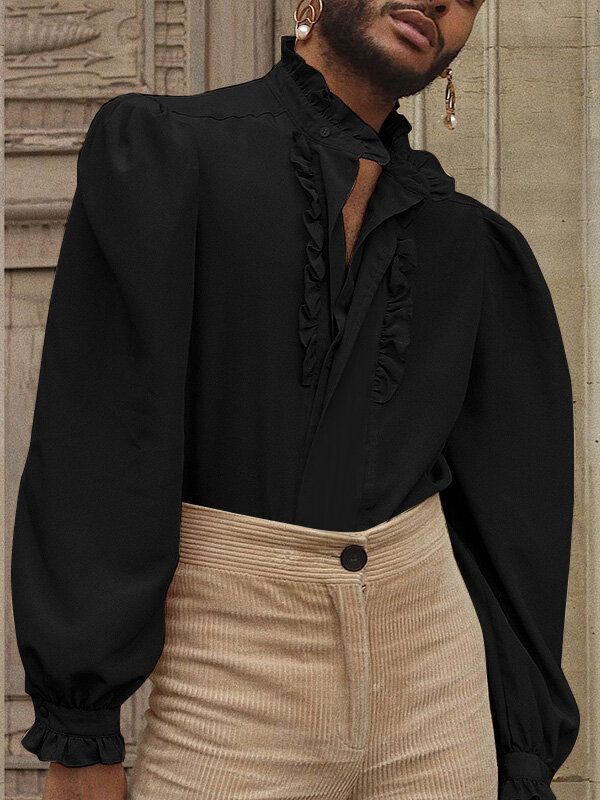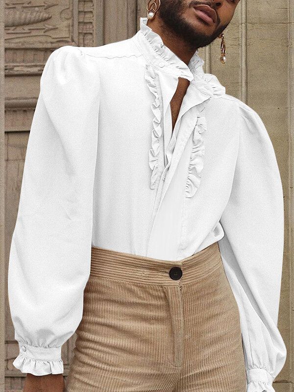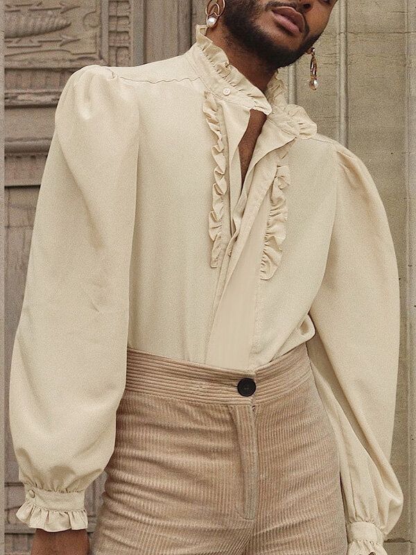 Mens Puff Sleeve Ruffle Neck Button Shirt