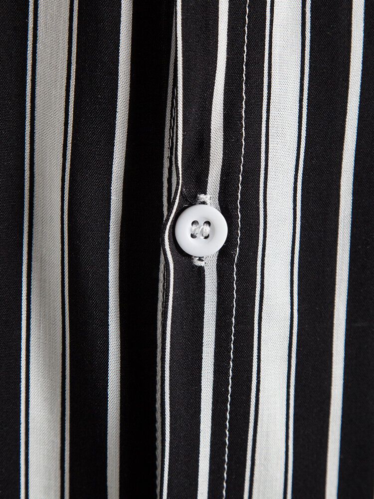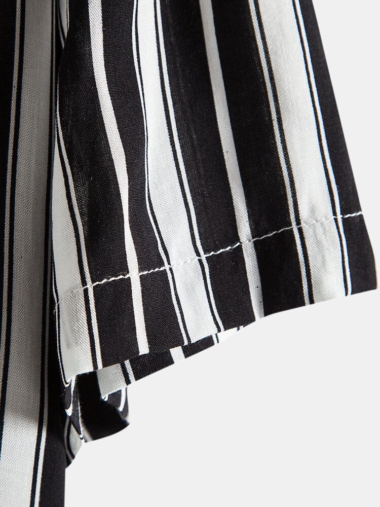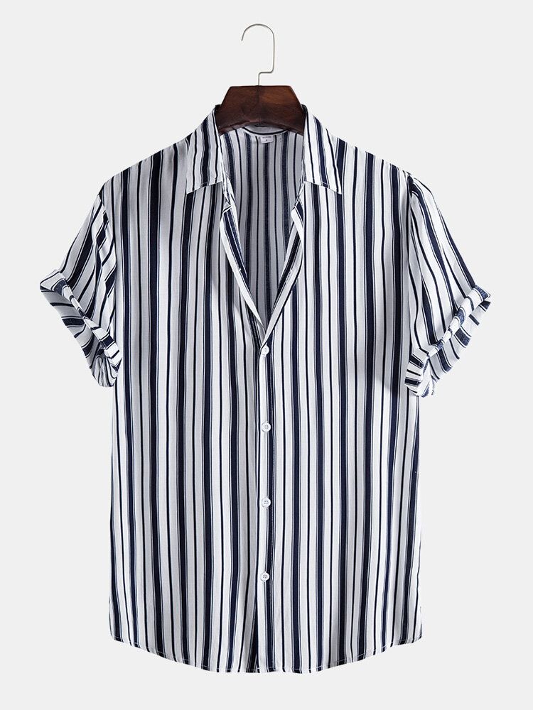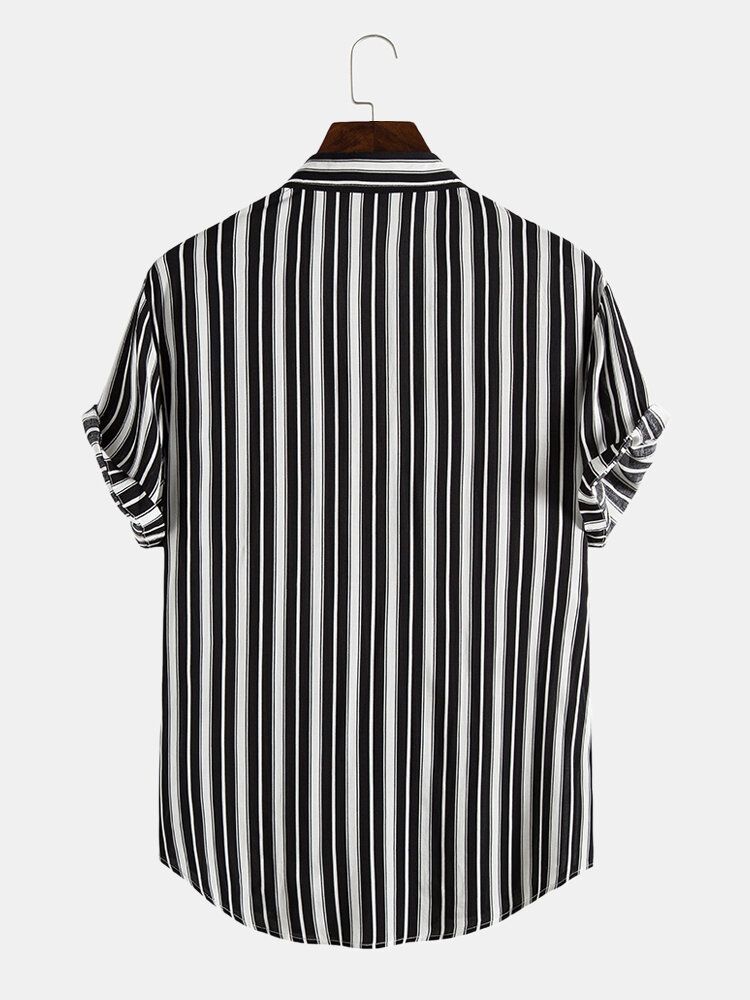 Mens Black Stripe Print Button Up Short Sleeve Lapel Casual Shirt