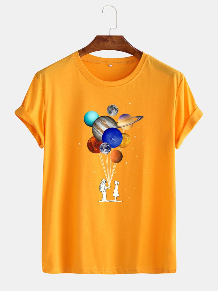 Mens Cotton Astronaut Colorful Planet Print O-Neck Casual Short Sleeve T-Shirts