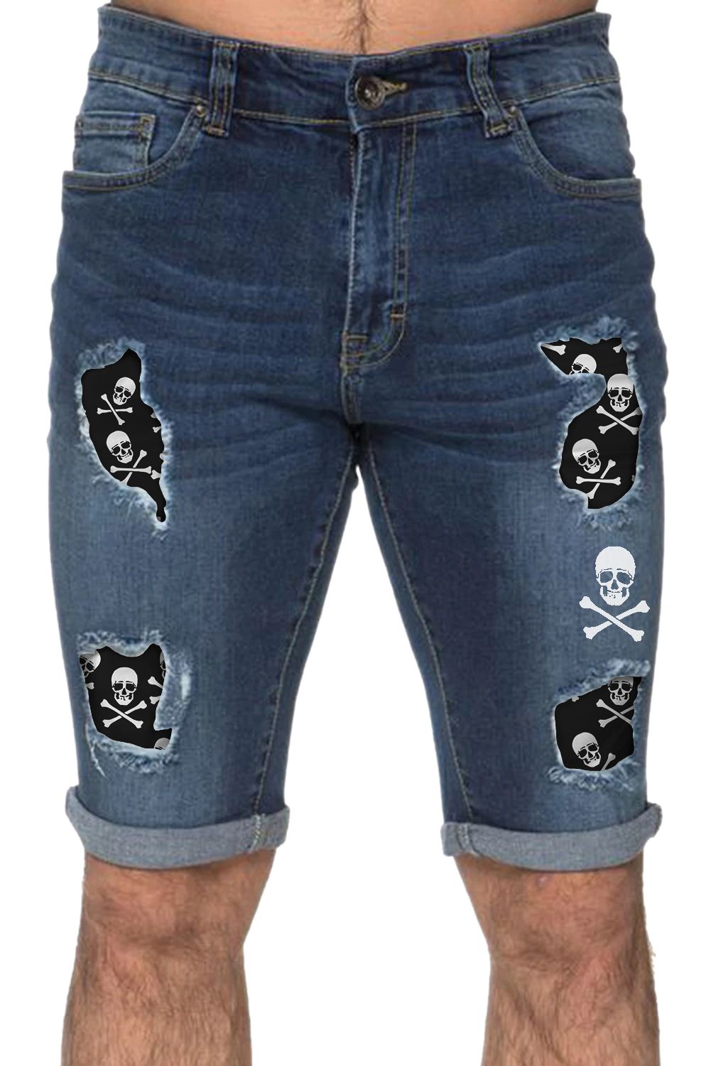 Sky Blue Skull Graphic Patchwork Distressed Skinny Fit Men's Jeans